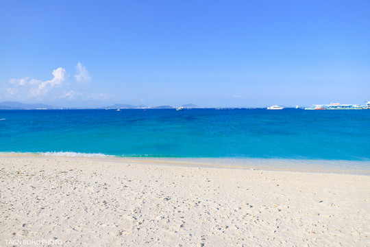 走上白色的沙灘,發現這里沙很細,很色,藍天白雲下,蔚藍的大海構成了一幅幅海天一色的畫,夏日里那一份美麗的景色在海邊表現得淋漓盡致,海風微微吹過臉龐,溫暖的熱風,走在海邊上,我忘記了這炎炎夏日,而眼多了一份大海的景色。