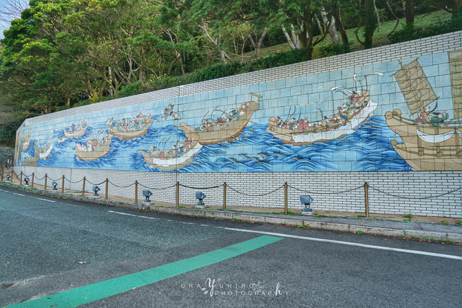 在這個展望台有一面高3米寬44米的有田燒壁畫,這幅壁畫用了1400枚有田燒,再現了壇之浦合戰中源義經連跳8船的英勇景象。