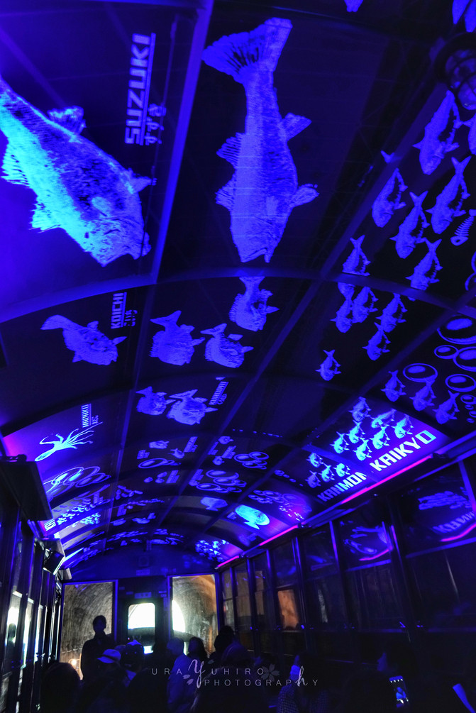 快到終點時會穿過和布刈隧道,這時候車內全暗,車頂上亮起夜光的各種魚類圖案。