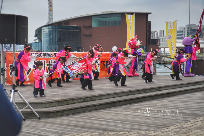 門前的步道平台上有小朋友在演出,後面的建築是下關市立水族館海響館。