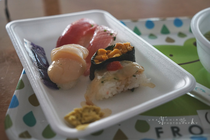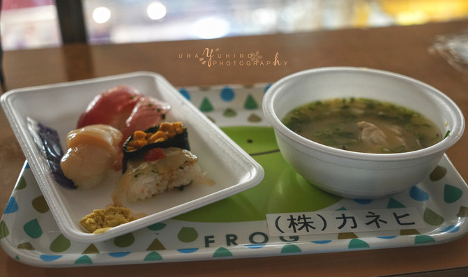 買好了壽司和上次來就很好奇的河豚海鮮湯,跑到市場二樓找了個位置開吃。