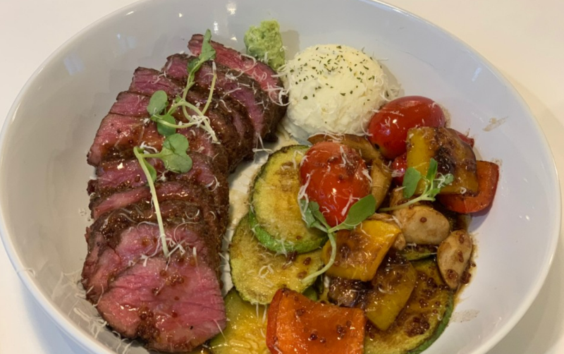 板腱牛排裡除了牛排外,還有聖女果,角瓜等蔬菜,牛排的肉質滑嫩,肉汁香濃,據說牛排調味醬也是店家的純手工做的...牛排跟蔬菜的組合真的太配太好吃了! 而且感覺非常健康哦!!