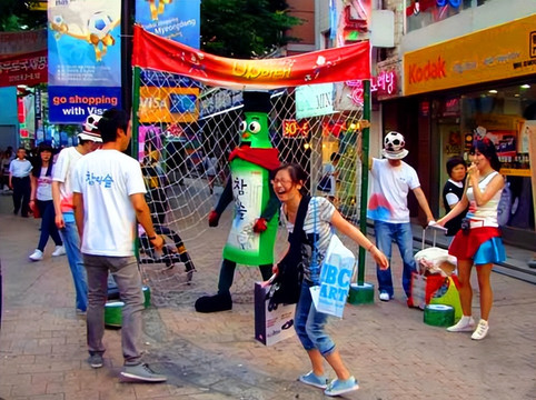 在明洞商街四周,各種大排檔遍布街中。豐富多彩、五顏六色、琳瑯滿目的小商品令人眼花繚亂,目不暇接。叫賣之聲不絕於耳。有的商店還在店前以娛樂活動的形式促銷商品,即增添了商店的人氣,又推銷了商品。