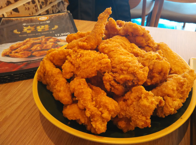 寶健路上找家炸雞店開吃。歐巴的炸雞,量還能再大點嘛: