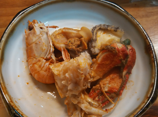 終於輪到我們了,點了個小份海鮮鍋,鍋子上來之後先不要急著動手,且看一鍋非常新鮮的海鮮放在面前,章魚的觸角還在翻滾蠕動,鮑魚的肉足還在收縮捲曲,然後眼睜睜地看著它們被煮熟,略顯殘忍。 。 。服務員會主動根據海鮮煮熟的程度來操作去殼和剪小塊,然後示意可以吃了的時候,就能開動了。