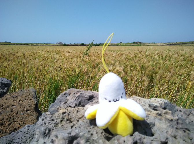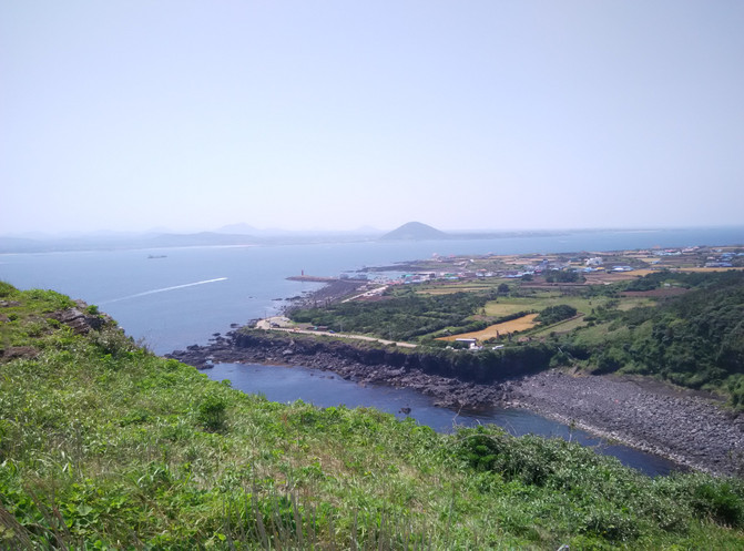 我們在綠叢環繞的山路上兜兜轉轉了好久,就在我再三懷疑我們迷路了的時候,視野突然開闊,鹹鹹的海風迎面撲來,蔚藍的大海在不遠處張開懷抱,果然跟著偶來小路就能看到最美的濟州。