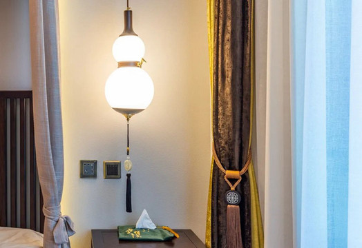 孔夫子曾說:心莊則體舒,心肅則容敬。這間氣派十足的大床房,第一眼就有一種大氣的舒適感,帷幔床、黃棕色系窗簾窗幔、古色古風的葫蘆形床前燈... 處處透露著清時的貴族氣息。