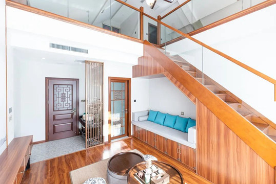 一層內嵌於樓梯下的沙發,能窩在裡面看電視也多了一份私密感;二層兩張大大榻榻米滿足了好友夥伴間抵足長談的小願望。