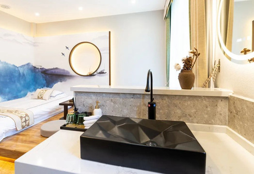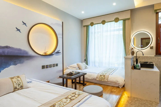 “孤舟蓑笠翁,獨釣寒江雪。”乍一推開房門,眼前、心裡恐怕就只剩這句話久久迴盪了。佔據了兩面牆的藍色彩墨,將這句詩表達的淋漓盡致,獨特的圓框設計既為照明,又似與遠飛南雁相映成趣的明月。睡於其中,恐怕夢都是美的吧!
