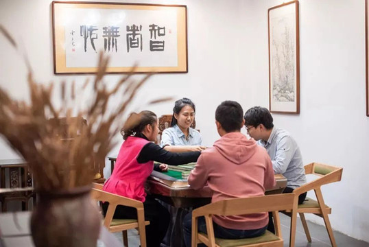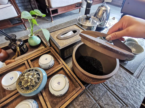 從一層到二層,3處品茶會客處,中間以陳列櫃、木隔斷、綠植隔開,哪怕隔壁坐著不認識的人也毫不尷尬。茶室免費提供的雅具、好茶,也都是民宿主精心甄選而來!