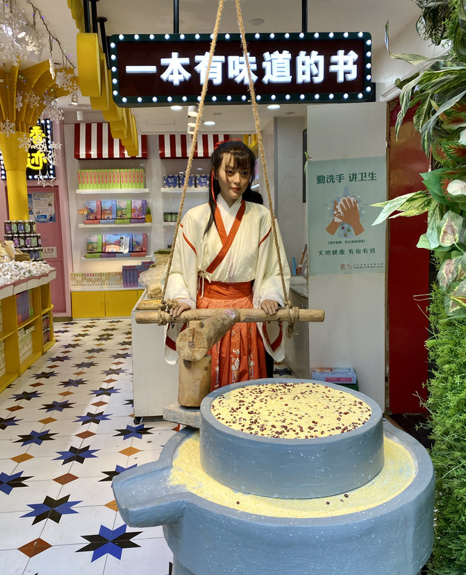 推磨的女子是機器人,動作逼真。