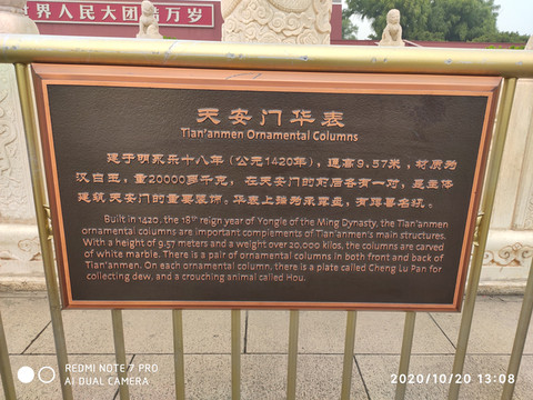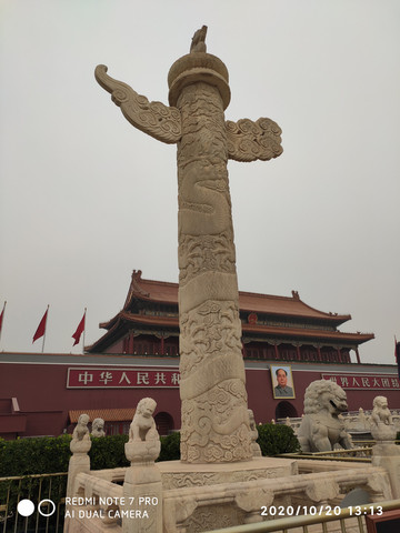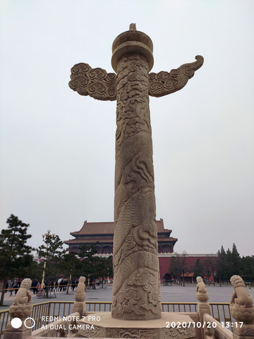 華表是天安門的一個重要標誌,與雄偉壯麗的天安門城樓、雍容典雅的金水橋、威武雄健的石獅子渾然一體,已成為天安門前一道特有的美麗景觀。天安門前華表頂上的那隻蹲獸叫"犼",望著皇宮外頭,人們稱它"望天犼"、"望君歸"。在天安門城樓後邊也有兩座同樣的華表,頂端也蹲著一隻石犼。華表上的石犼面向北,朝著皇宮的方向,人們稱它"望君出"。 "望君出"就勸誡皇帝不要老是待在宮殿裡,該到民間看看百姓的疾苦。