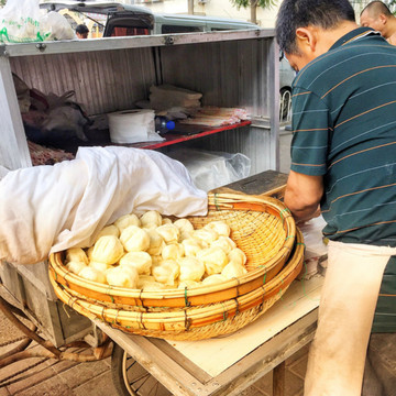 教子胡同與輸入胡同的交叉路口,偶遇一位老大爺的包子攤,6:25,排著五六個人,每個人都10個20個地買包子。包子只有一種牛肉大蔥餡兒,堆在筐里,簡易的三輪車,邊上還有一張桌子,放著醋和辣椒油,買的人看著像是附近居民,有人直接在一旁現買現吃,一口包子蘸著辣椒油,垂涎欲滴。