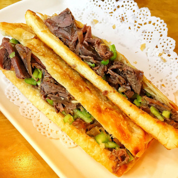 驢火分精品和普通的兩種,精品是純瘦肉帶筋,普通有肥瘦各半。現擀現烙的火燒火候很關鍵,第二晚的比第一晚的更鬆脆好吃。鹵好的驢肉片和青椒作伴,細膩肉質鬆脆火燒,再來一口驢肉湯,趁熱吃非常好。