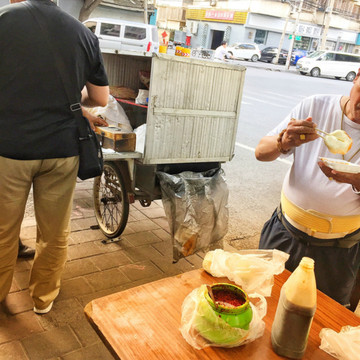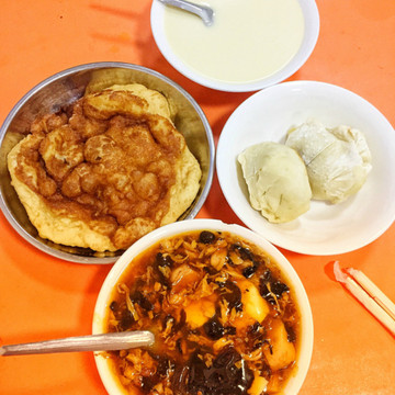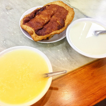 這家店挺出名的,1928年開業至今的老店,只為吃上一口豆腐腦和糖油餅,5:30到店的時候前面排著3人,等6:10我們吃完出門隊伍已經挺長了。他們家堂食和外賣分兩個窗口排隊,但只有一人在裡面張羅,所以顧得上一頭另一頭就得等,本質上還是排著一隊。這家店很便宜喔,人均5元就能吃頓不錯的早餐。