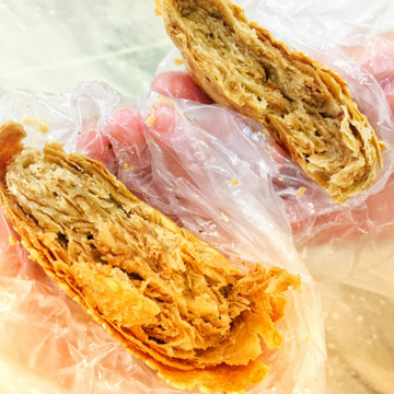 李記金牌燒餅1元1個,椒鹽燒餅是這裡最出名的,外賣窗口不限購買量,堂食限購,所以很多人先外賣口排隊買了帶進店裡吃。半發麵,和麵醬料加了芝麻醬、花椒、鹽,溫度夠所以表皮脆香,層次分明。北方燒餅是比較粗放的存在,雖然個頭只有手掌心大小但能長時間保持不飢餓。可以試試。