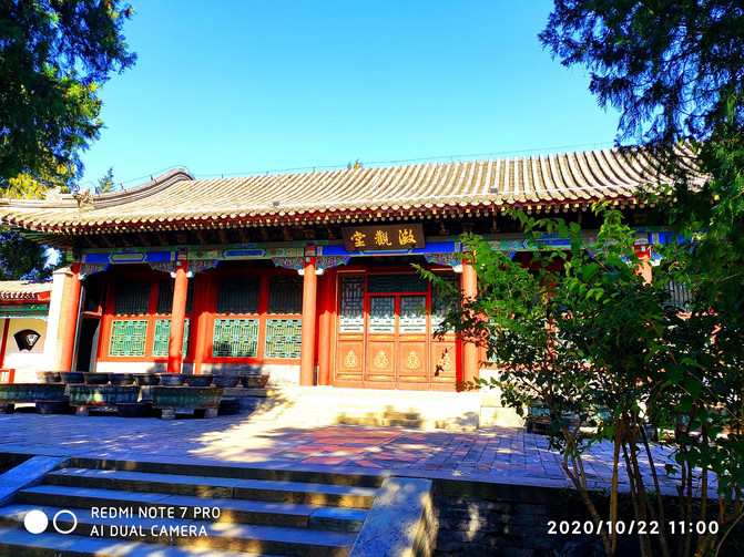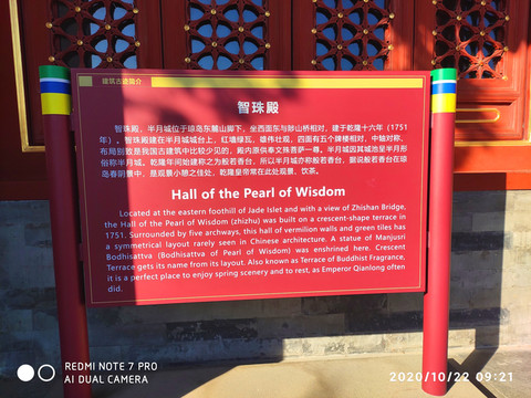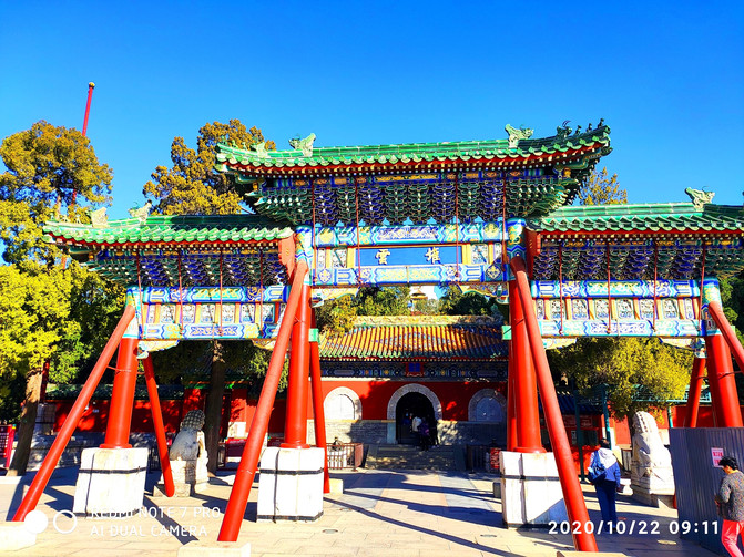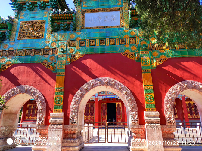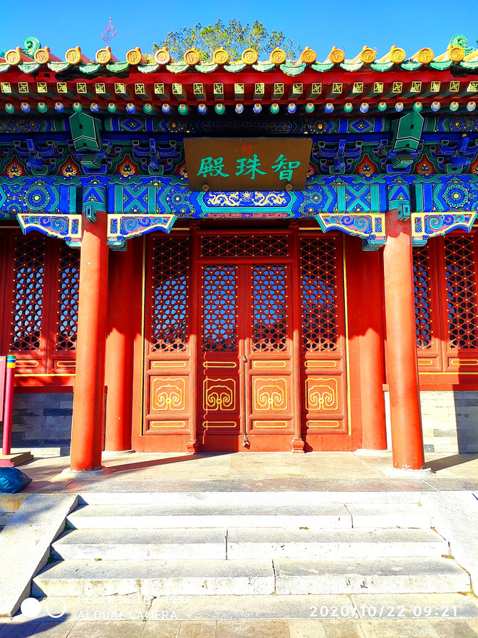 智珠殿,半月城位於瓊島東麓山腳下,座西面東與陟山橋相對,建於乾隆十六年(1751年)。智珠殿建在半月城城台上,紅牆綠瓦,雄偉壯觀,四面有五個牌樓相對,中軸對稱、佈局別緻是我國古建築中比較少見的,殿內原供奉文殊菩薩一尊。