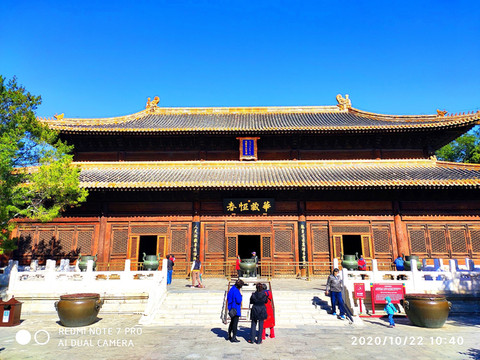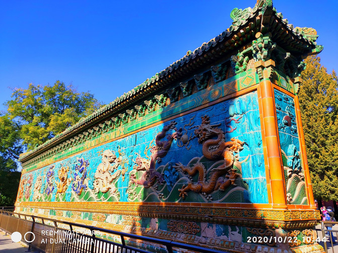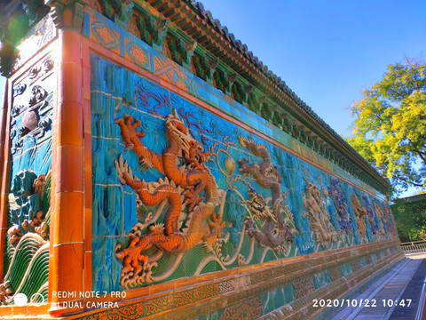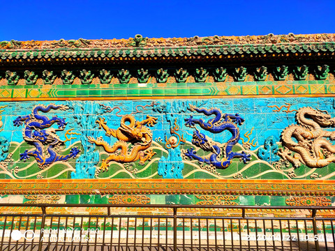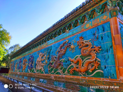 九龍壁是原大圓鏡智寶殿前的影壁,建於乾隆二十一年(1756年)。壁高5.96米,厚1.60米,長25.52米。壁的兩面用七色琉璃磚瓦鑲砌而成。兩面各有九條彩色大蟠龍,飛騰戲珠於波濤雲際之中。壁上共有大小蟠龍635條。中國現存三座古代九龍壁,唯獨這座是雙面壁,它是中國琉璃建築藝術的精華。