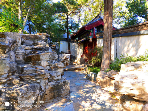 西側院中有小池一方,池畔疊石圍合。向北橫隔著一個走廊,走廊北邊有一六角小亭,在堆疊的巨大太湖石映襯下,顯得非常精巧美觀,這就是“枕巒亭”,乾隆曾譽其為“蓮朵湧珠宮”。