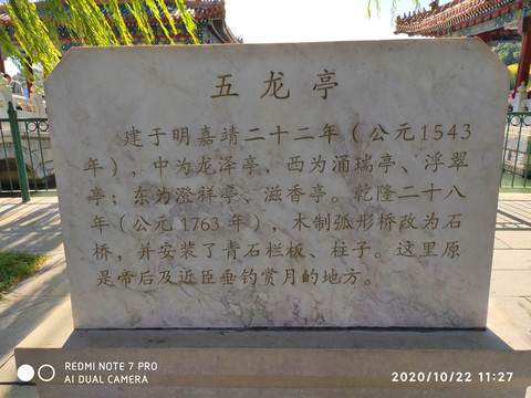 五龍亭建於明萬曆三十年(1602 年),中為龍澤亭,左為湧瑞亭、浮翠亭;右為澄祥亭、滋香亭。原是帝后及近臣垂釣賞月的地方,乾隆二十八年( 1763 年)將木製弧形橋改為石橋,並安裝了青石欄板、柱子。光緒二十六年( 1900 年)欄板、柱子遭八國聯軍破壞, 1974年照原樣予以恢復。現存五龍亭成為人們眺望白塔及北海湖光山色和休息的地方。