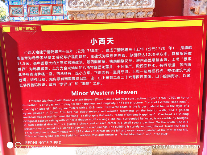 小西天始建於清乾隆三十三年(公元1768 年),建成於清乾隆三十五年(公元1770 年),是清乾隆皇帝為母親孝聖皇太后祝壽祈福而建的。主體建築為極樂世界,總面積達1200平方米,其橫梁跨度13.5米,是中國最大的方亭式宮殿建築,殿四面窗扉、楠扇細鏤花紋,殿內高處懸掛金匾,上書“極樂世界”為乾隆御筆。上方為金光燦燦的八角穹窿團龍藻井,十分莊嚴。殿四面環水,有橋可通,東西南北各有琉璃牌坊一座,四角各有一座小方亭,正南面有一道月牙河,上架一座雕欄石橋,整體建築氣勢磅礴,雄偉壯觀。