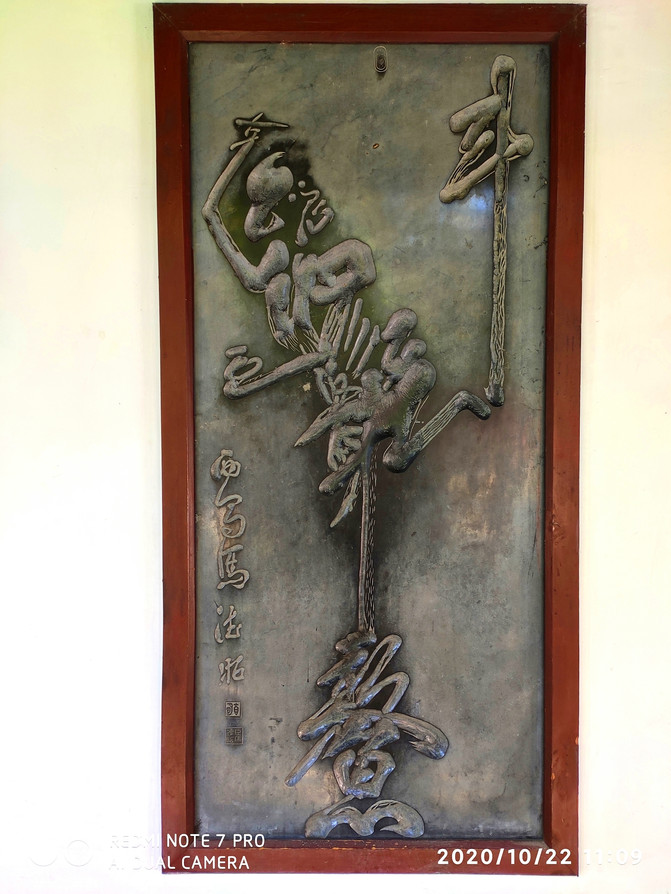 元代遺物,壁呈棕褐色,由中性火山塊礫岩雕成,因顏色和質地似鐵,故稱鐵影壁。壁高1.89米,長3.56米,兩面淺雕雲紋異獸,刻工古樸渾厚。鐵影壁原是建德門(今德勝門)外一古廟前的照壁。明初,此壁被移到德勝門內護國德勝庵前(今鐵影壁胡同內),1947年壁身移至北海公園。1986年北海公園從鐵影壁胡同找回基座,從而使這一文物得以復原。老北京原有地安門的“金門墩”、東安門外的“銀閘”、新街口北大街銅井胡同的“銅井”、德勝門的“鐵影壁”和太液池北岸的“錫殿”,“金、銀、銅、鐵、錫”五大古蹟,如今只剩下這座“鐵影壁”了。