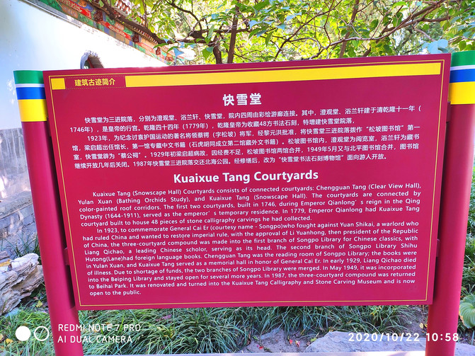 快雪堂書法博物館始建於乾隆四十四年( 1775 年),院內還有澄觀堂、浴蘭軒兩座大殿。四周由彩繪遊廊連接,快雪堂東西兩側的遊廊內嵌有晉代至元代二十位書法家八十篇墨跡石刻四十八方,其中王羲之快雪時晴帖與乾隆皇帝所做的快雪堂記最為著名。