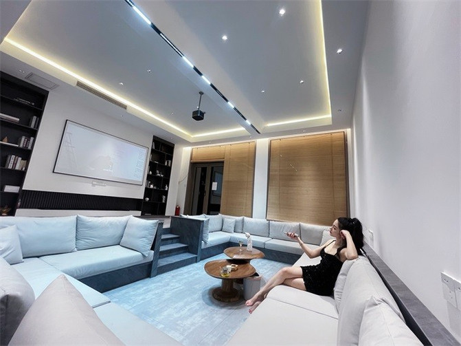 客廳佈置得還是挺溫馨的,不僅有很多裝飾,各種精美小燈,還有專業投影設備,看起電影很棒!牆的一側是一個大型書架,可以坐在沙發上悠閒的閱讀。民宿有精緻的茶具,在清晨或午後的陽光,一杯清茶、一杯咖啡。