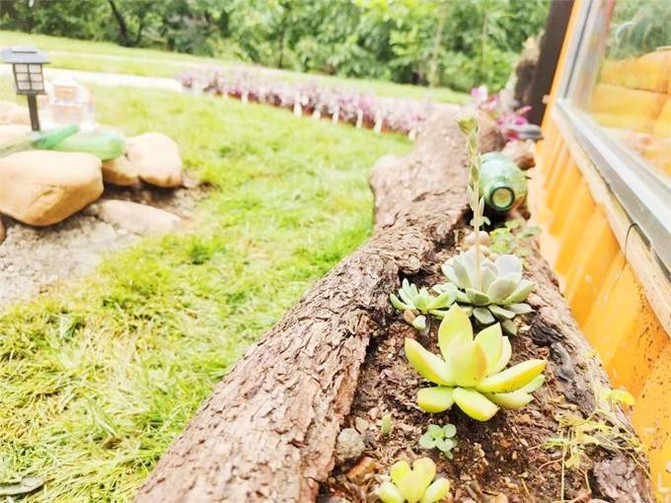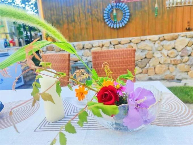 民宿門口擺放著桌子和椅子,客人們可以在這裡吃飯娛樂,門口都是正值綻放的鮮花,看著這滿院的花花草草,心情也非常的愉悅。