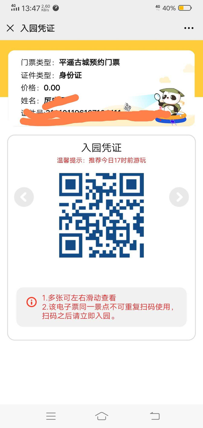 從喬家大院到平遙古城40分鐘車程,下午1點半已經在古城北門,掃碼預約進入古城,生成以下二維碼便可入古城,並請截圖保存,憑二維碼在古城內游覽各景點。