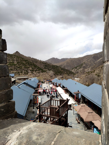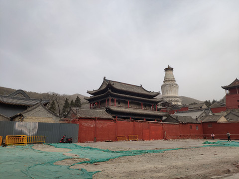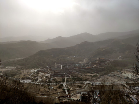 站在山頂俯瞰台懷鎮,灰濛蒙的,五台山的標誌——大白塔隱約可見。這個天氣啊!