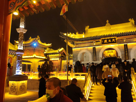 餐後趕去五台山唯一晚上開放的廣化寺(驅車10來分鐘),雖然遊客眾多,寺院的僧眾仍在大雄寶殿裡念經修行。在大雄寶殿後,有一九龍浴佛的雕像,講的是佛陀在誕生時,有九條龍過來給佛陀洗身子的典故。我們也隨著眾人給佛陀勺了一瓢水。璀璨燈光下,美輪美奐。