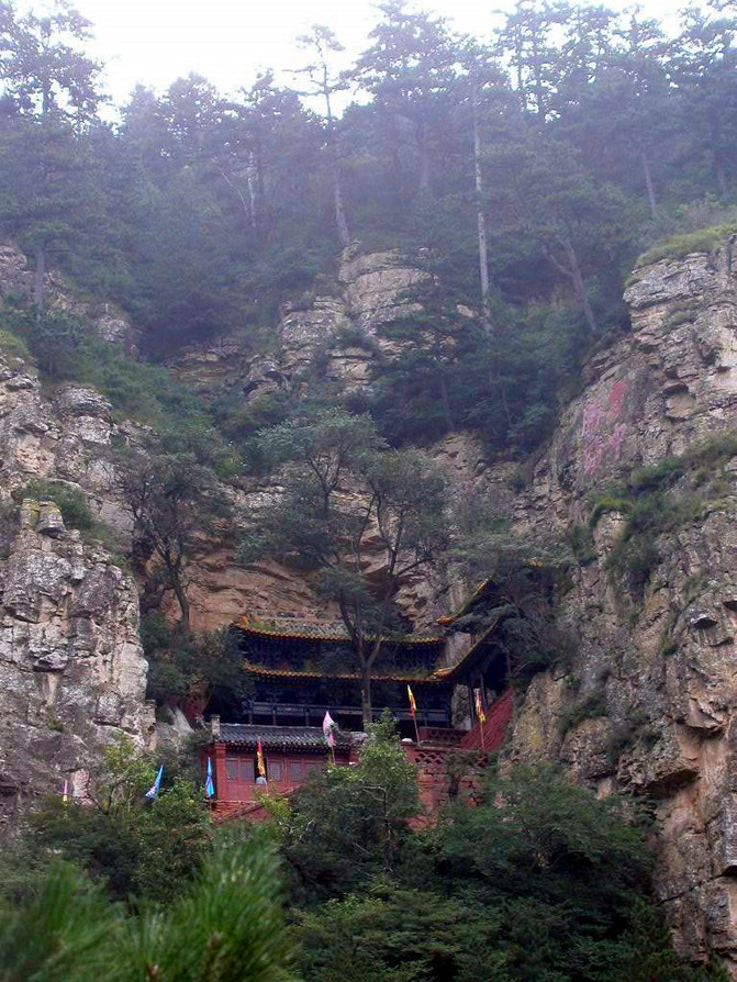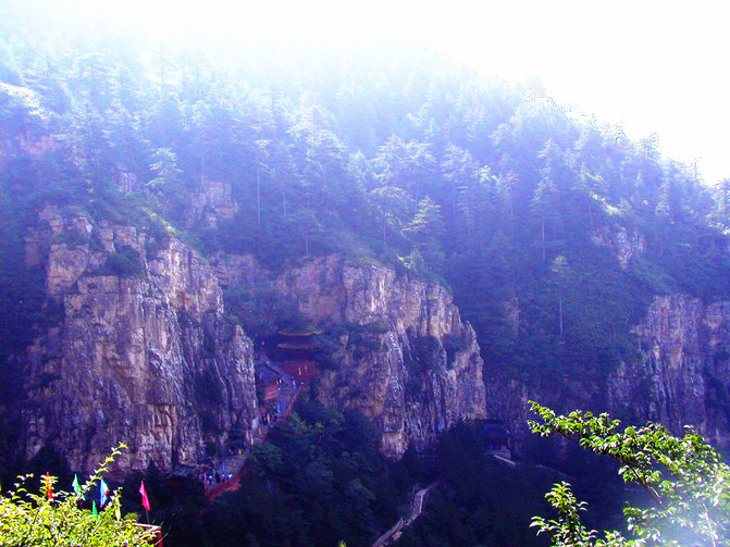 原路返回,再向上攀登,就來到北岳恆山的主廟“恆宗大殿”,它建在恆宗峰南半山腰的峭壁間,背崖臨谷,雄視南天,很是壯觀。進山門,正中有陡階103級,而且級級向前傾斜40度,上的時候真有點腿抖。據說這103台階,包含著道教的玄機,道教認為“天地奇數偶數相加剛好100,再加上道教的三清剛好103”,以前對道教一無所知,這次才對道教有個大概了解。