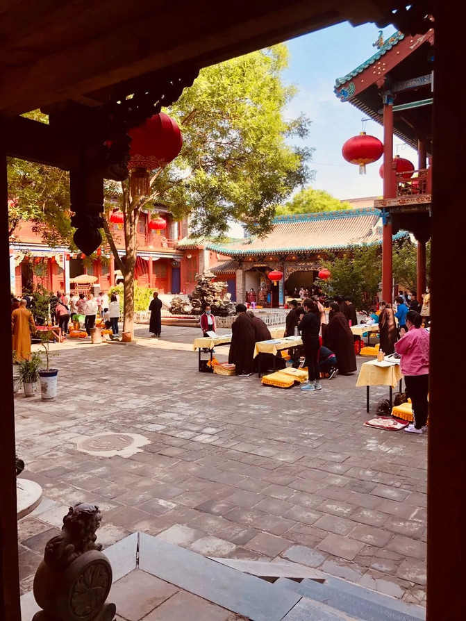 剛剛一進門時,就听到嗡嗡的唱誦聲。原來是右殿內正在舉行法會。只見殿內院中,數位主持高僧在經堂高唱經文,宏亮的唱經聲環繞不絕。一眾善男信女則在院內低聲跪拜唱誦,一片莊重。