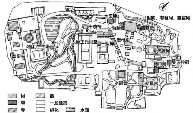 整個館區背靠懸翁山,前接晉水。最早在周代修建,以祭祀晉地祖先唐叔虞和其母邑姜。歷經兩千載不斷毀壞後又不斷擴建翻修,形成今日之格局。