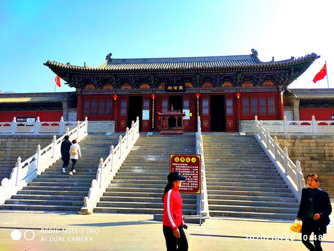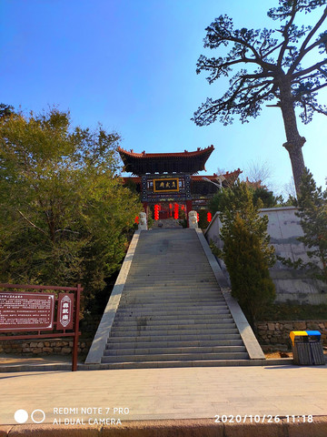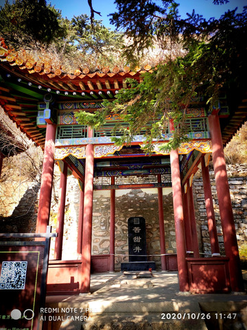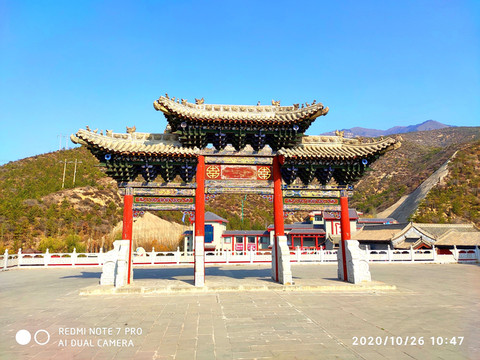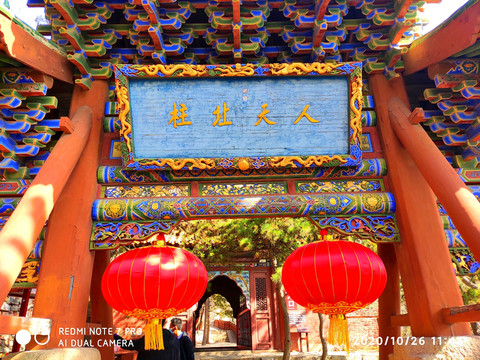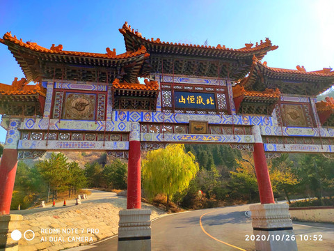人天北柱。恆山主峰天峰嶺,海拔2016.1米,被稱為“人天北柱”,“絕塞名山”,“天下第二山”。看到人天北柱就開始進入廟群區,過了人天北柱牌樓是馬神殿。馬神殿又叫御馬間,是為北嶽大帝的坐騎而建。帝位的尊貴其馬如同其主,故稱“神駒”,於是建廟以神供奉。