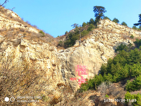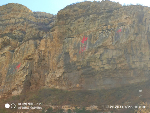 山體上有“恆宗”兩個大字,這個是明成化三十年大同知府張昇手筆,每個字高13米,寬6米,面積達30平方米。大“恆宗”左側還有題縮小的“恆宗”二字,看不清落款。上方還有小篆“大明”二字,恆山的摩崖石刻,字周圍經常要寫一些小字的內容,也算是個特色。