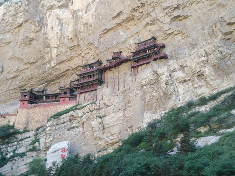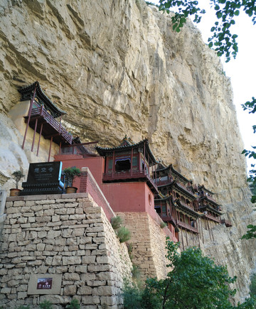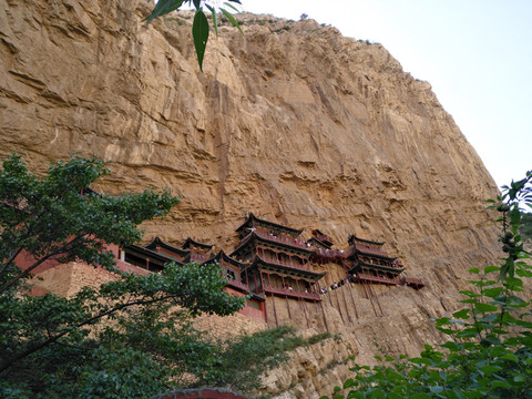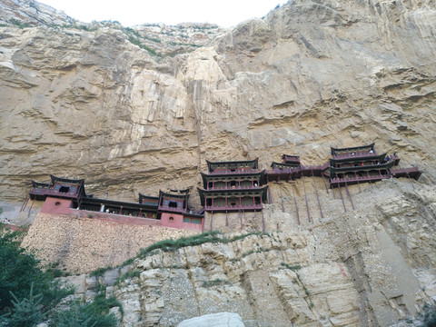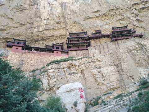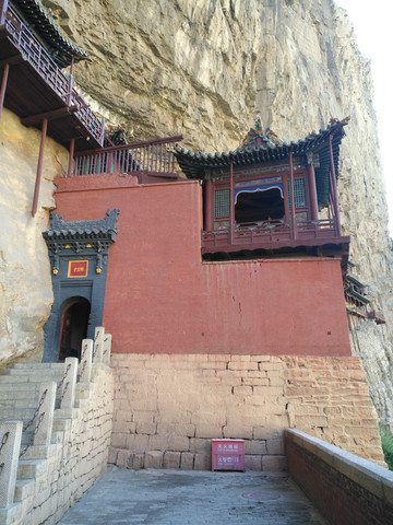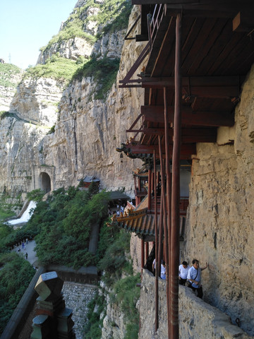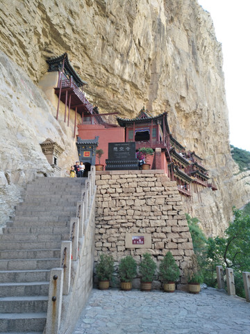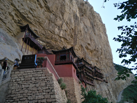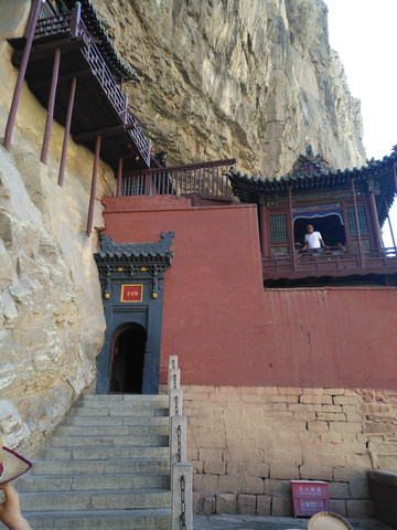 我們在景區門口的快餐店吃了簡單的午餐,然後進入景區,景區首道門票是免費的,但登臨懸空寺的門票每張需要100元。景區大門建在峽谷口,剛好擋住了人們視線,在外面無法看到懸空寺。我們進入大門後走沒多久,只見在前面巨大的山體上,一座寺廟像貼在懸崖峭壁間一樣,站在下面看,整座寺廟就像由十幾根比碗口還粗的木柱支撐著。我屏住呼吸,遠遠地抬頭仰望這座懸在邊塞絕壁間雄偉壯觀的寺宇,心中感到無比震撼!