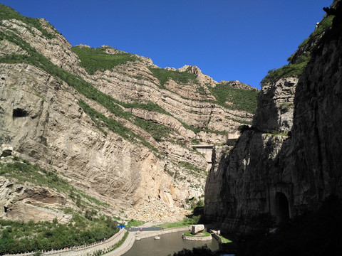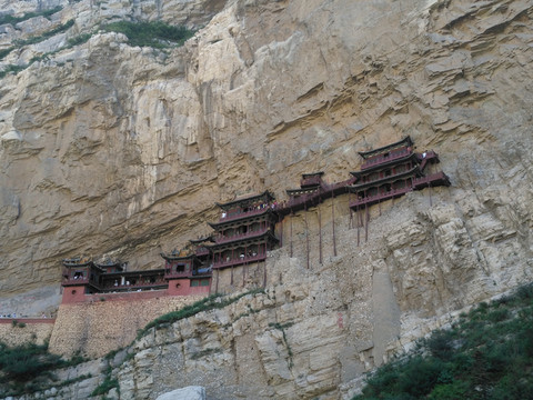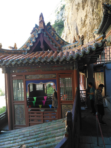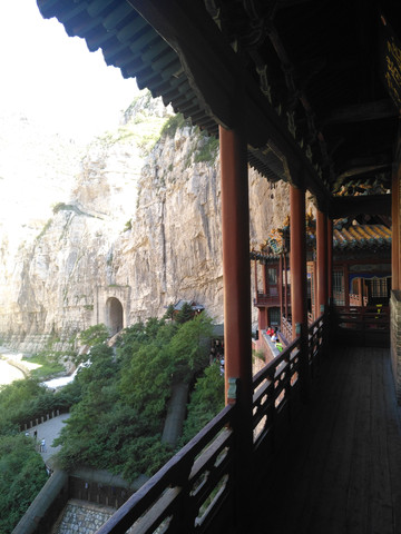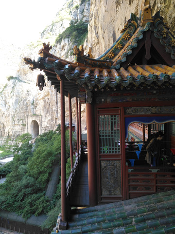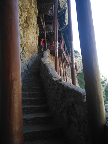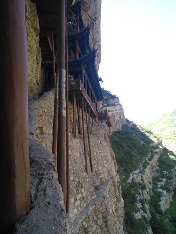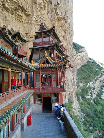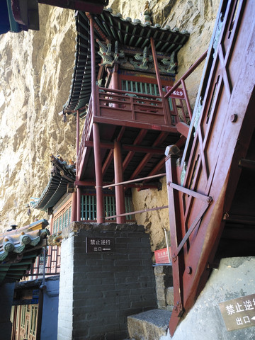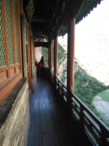 沿著窄狹的石階逐級而上,我們小心謹慎地攀爬懸空寺,石階和廊道是緊貼著懸崖峭壁的,很多地方只能容一人通過,在稍寬闊處和其他遊人相遇,雙方也要側身而過。穿過幾間小小的閣樓,來到寺院一樓前的平台,雖說是一樓,其實此處距地面已有幾十米高了,站在這裡,金龍峽壯麗的風光盡收眼底;回頭仰望從絕壁間伸出的殿宇和飛簷,令人有一種目眩的感覺,可以想像當年工匠們在絕壁間修建殿宇時具有何等的勇氣!我顫抖著雙腿繼續攀登上面的各個殿宇,面積都是很小的,而且越來越高,我的心急促地跳著,也不敢細細欣賞,一步一步在向前邁進,唯恐踩錯腳下的梯級。當我站在最上面的小殿前,腳下就是懸崖峭壁,對面峽谷因地質強烈運動形成的彎曲岩層清晰可見,真可謂岩壁立千屻,大氣磅礴!此情此景,我們怎不為大自然的鬼爺神工而感嘆啊!