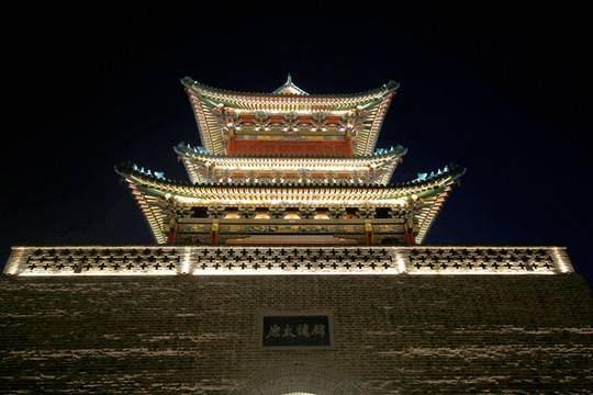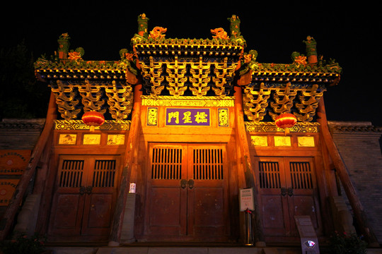 晚上出去逛平遙古城夜景,發現城門樓全部沒有亮燈,有點不可置信,詢問當地人晚上幾點鍾亮燈,也說不會亮燈,走在白天已經走過的街道上,來到中心的牌樓處,看看確實沒有什麼夜景可賞,於是返回客棧。