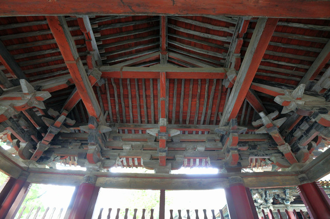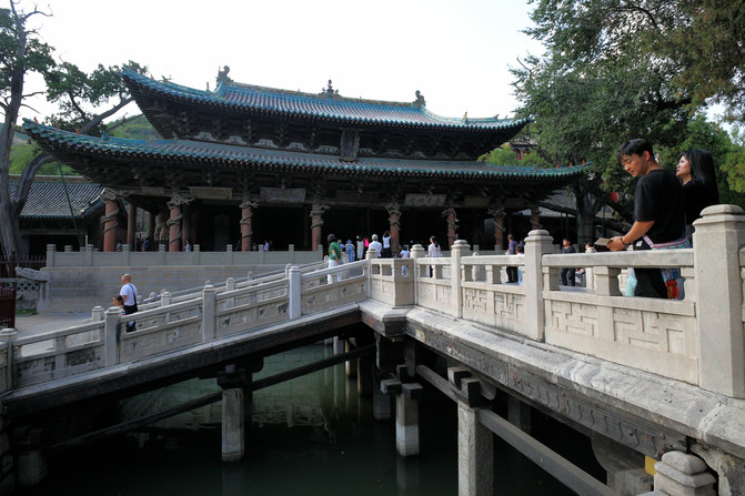 二是魚沼飛梁,位於聖母殿與獻殿之間,為晉水第二泉源。古人以方為沼,圓形為池,因池中又多魚,故名魚沼。其上立架十字形橋,下由18根八角石柱支撐,橋面東西寬闊,南北下斜如翼,整個造型猶如展翅欲飛的大鳥,故稱飛梁,最早在1500年前的北魏已經建成,現在我們看到的魚沼飛梁是宋代的遺存,距今也有900多年的歷史。宋代十字橋魚沼飛梁,曾在敦煌壁畫中出現過這種樣式,現實中僅此一例。