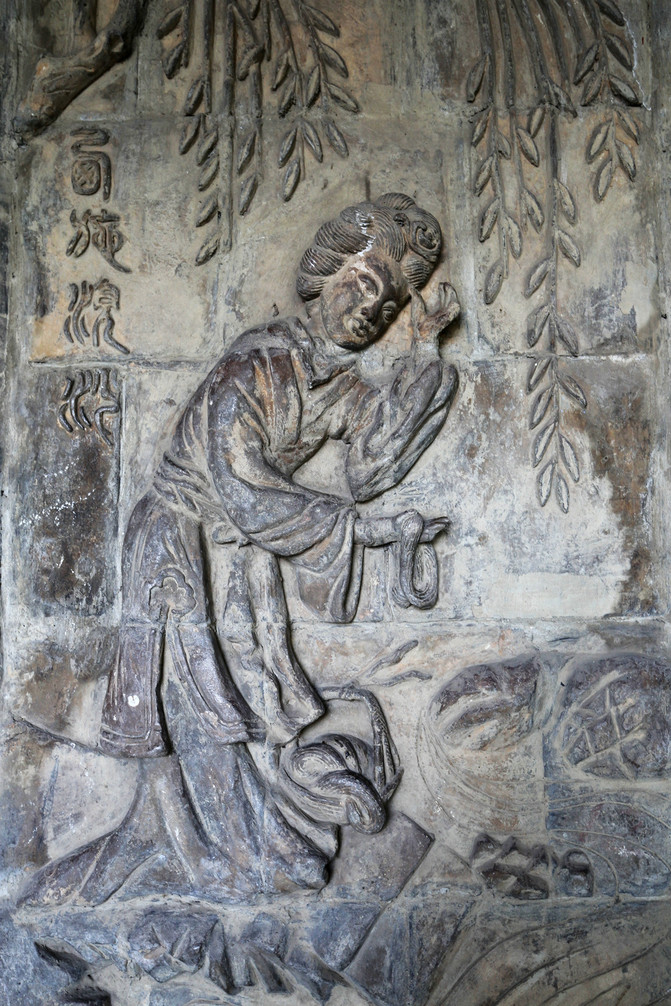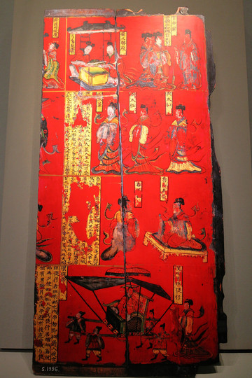 北魏司馬金龍墓木板漆畫,1965年出土於北魏貴族司馬金龍與其妻欽文姬辰的合葬墓。這是為尚能拼合的第一、第二塊向上的一面。第一、二塊屏風畫用欄界分為四層。第一層六個人物,為帝舜格守孝道的故事;第二層三個人物為周太王妃太姜、周武王母大姐、周文王母太任的立像;第三層兩個人物,為魯師春姜及春姜女像;第四層六個人物,為班捷仔辭成帝同乘輦故事。所畫人物用黑線作鐵線描,臉、手塗鉛白,服飾器具用黃白、青綠、橙紅、灰藍等色渲染,畫風與東晉名畫家顧愷之的作品十分相似,面相則已見南朝“秀骨清相”之端倪。題記文字則介於隸書和楷書之間,氣勢舒朗,是少見的北魏墨跡。遺憾的是這是一件複製品,先前在出土地大同博物館看到的也是複製品,可見這件文物的價值有多珍貴,也從側面說明了這件被列入首批禁止出國展覽的文物有多麼脆弱。