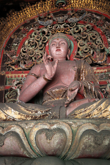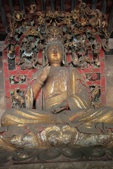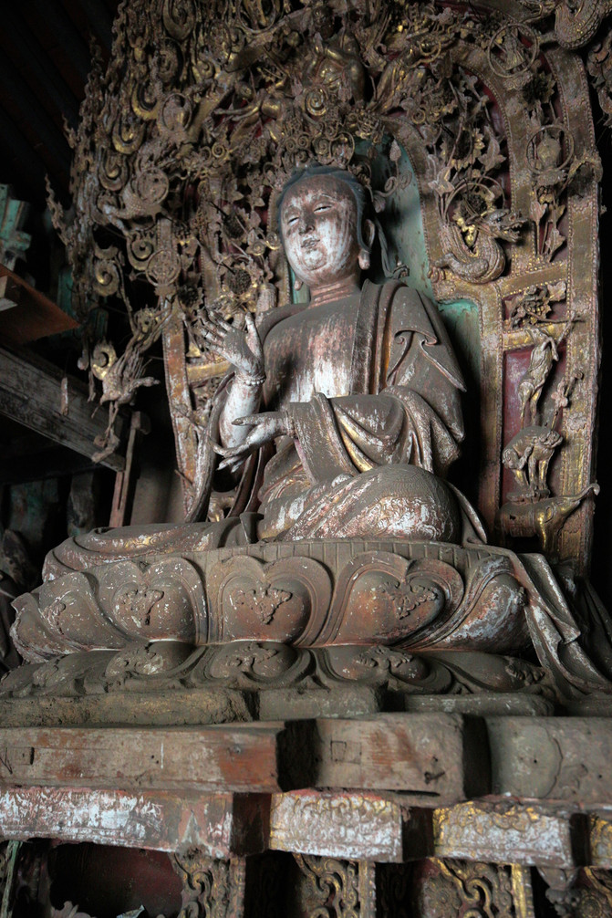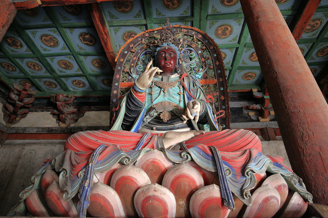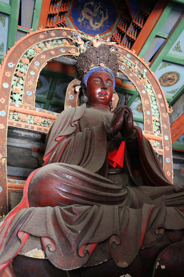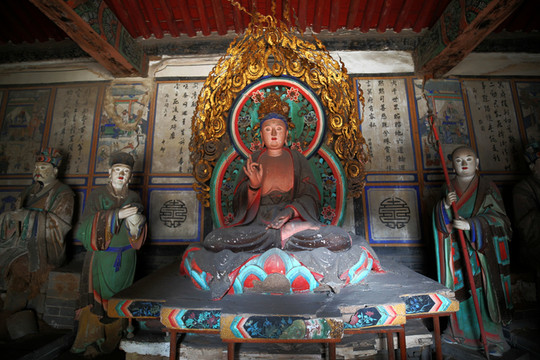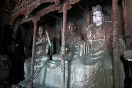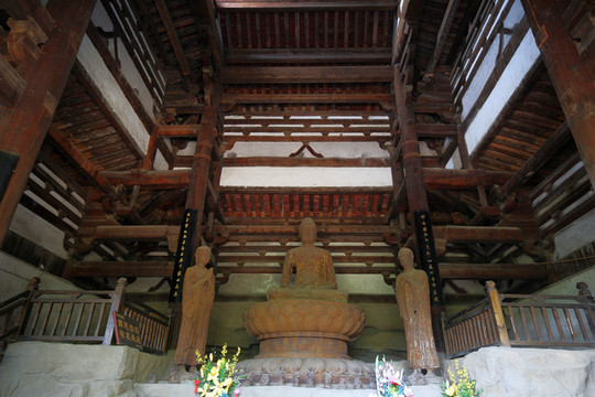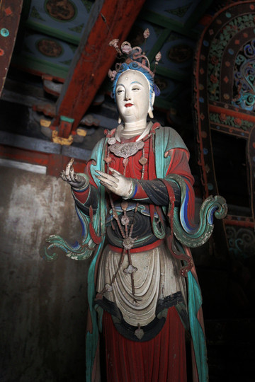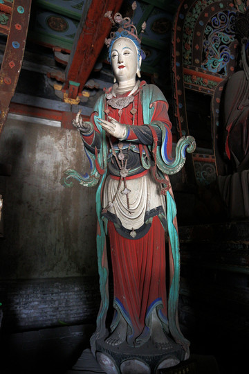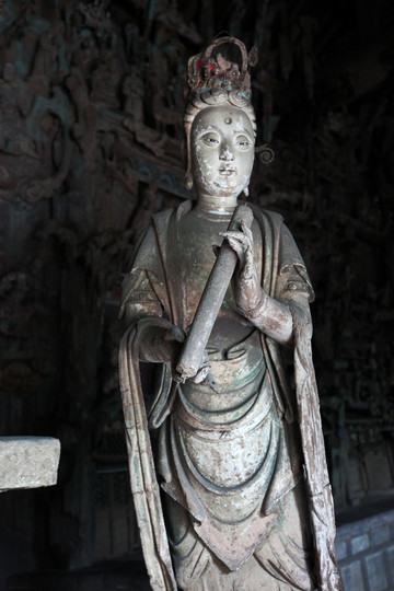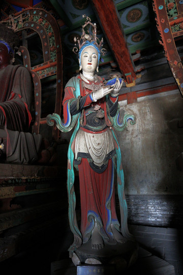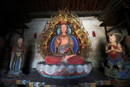 釋迦殿內,釋迦正中高坐,左右脅侍文殊、普賢菩薩。東尊文殊菩薩手持經卷,西尊普賢菩薩手持蓮花,俱戴簪花冠,發後繫帶,兩肩披天衣,飄帶沿肩挂臂而下,造型簡練而具親切感,顯示明代塑像趨向人性化的風格。
