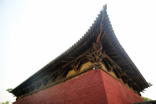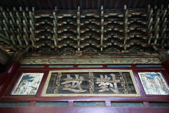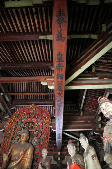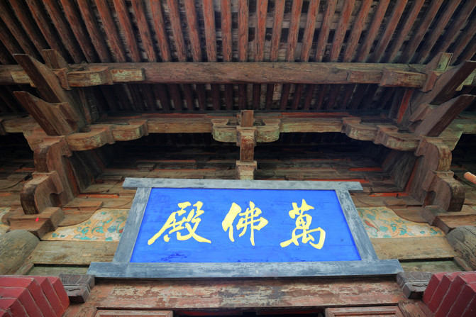萬佛殿是鎮國寺的主殿,萬佛殿內的樑架上至今清晰地留有建殿時的題筆——“維大漢天會七年建造”。大漢天會七年即北漢王劉鈞天會七年(963年),由此可見鎮國寺萬佛殿至今一千多年的歷史。
