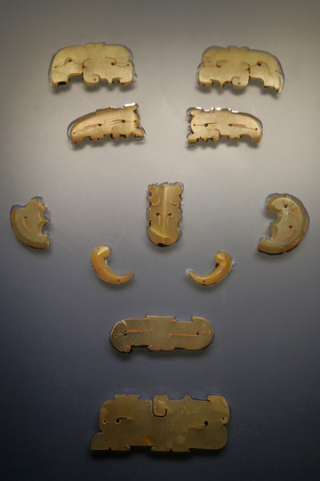 晉穆侯次夫人玉組佩,1993年出土於山西曲沃縣晉侯墓地,所謂次夫人,就是原配死後續娶的正妻。這是整個晉侯墓地出土的最大的玉禮器組合,也是目前全國同期墓葬中發現的最大的玉組佩,在我國玉器史上擁有舉足輕重的地位。展品旁邊配了張發掘現場的照片,只見整個棺木里面鋪滿了玉佩的組件,非常震撼。