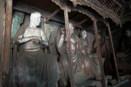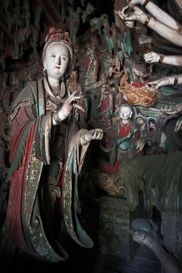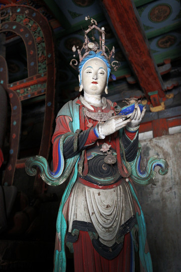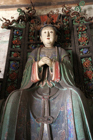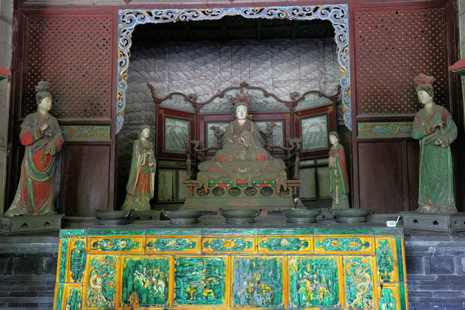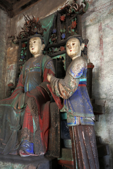 二是宋代彩塑,聖母殿內供奉著四十三尊彩塑。主像是聖母邑姜,其餘四十二尊是宦官、女官和侍女。聖母鳳冠蟒袍,端坐在鳳頭椅上。侍女手裡都拿著侍奉的東西。有的伺候飲食,有的負責梳洗,有的專管打掃,眉眼有神,姿態自然,塑工精美,是中國雕塑史上的精品。