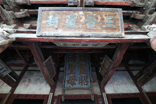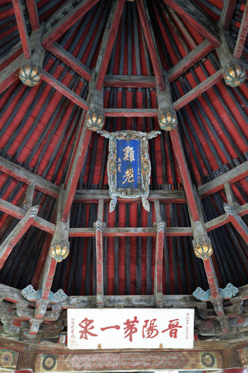 水鏡台上部所懸匾額“三晉名泉”,是清康熙武舉楊廷翰所書,而清代補建的捲棚上懸正額“水鏡台”,是清乾隆翰林楊二酉所題,被譽為晉祠三大名匾之一。有趣的是,楊二酉是楊廷翰之侄,伯父與侄兒,一武一文,各題名匾,一前一後,同懸於水鏡台上,為這座戲台增色許多。據說86版《西遊記》孫悟空大戰二郎神時所變的小廟宇就是以晉祠水鏡台為原型的。