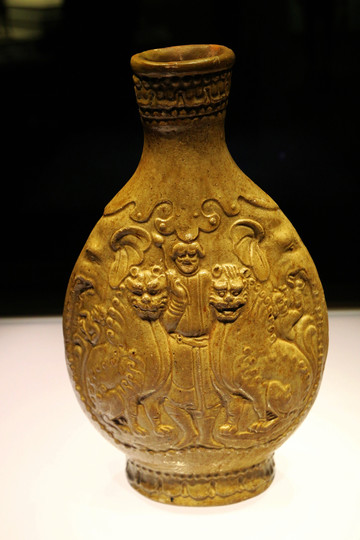 北齊黃釉胡人雙獅紋扁壺,1956年山西省太原市玉門溝出土。橢圓形口,短束頸,梨形腹,腹部扁平,高圈足。正背面模印相同紋飾,呈淺浮雕狀。腹壁正中站立一胡人,左手持物似骨朵,身前兩側蹲坐兩隻獅子。壺壁兩側模印象首,長鼻垂於底部。聯珠紋邊框。口部、足壁部分模印聯珠紋蓮瓣。該器明顯受外來文化影響,是北朝時期中西文化交流的見證。