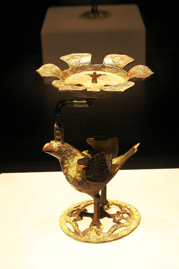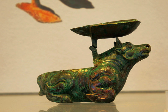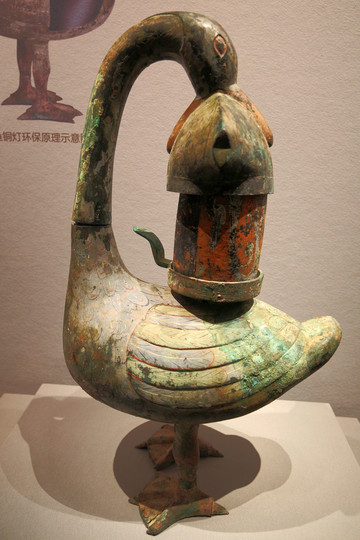 漢代彩繪雁魚銅燈,1986年山西襄汾縣吳興莊出土。造型為鴻雁佇立,回首銜魚,雁頸與燈體以子母口相接,魚身與雁頸、腹腔中空相通。圓形燈盤附柄,可自由轉動,盤下圈足與雁背直口套合。