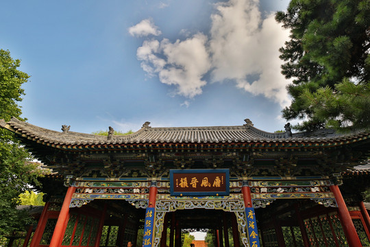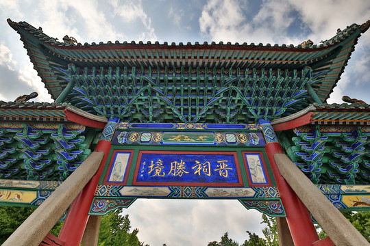 走入晉祠公園,首先映入眼簾的是一座青色的琉璃牌坊,牌匾上書“晉祠勝境”四字,牌坊始建於明代,為四柱三樓式建築。1984年,從太原郝莊鄉馬莊遷於此。